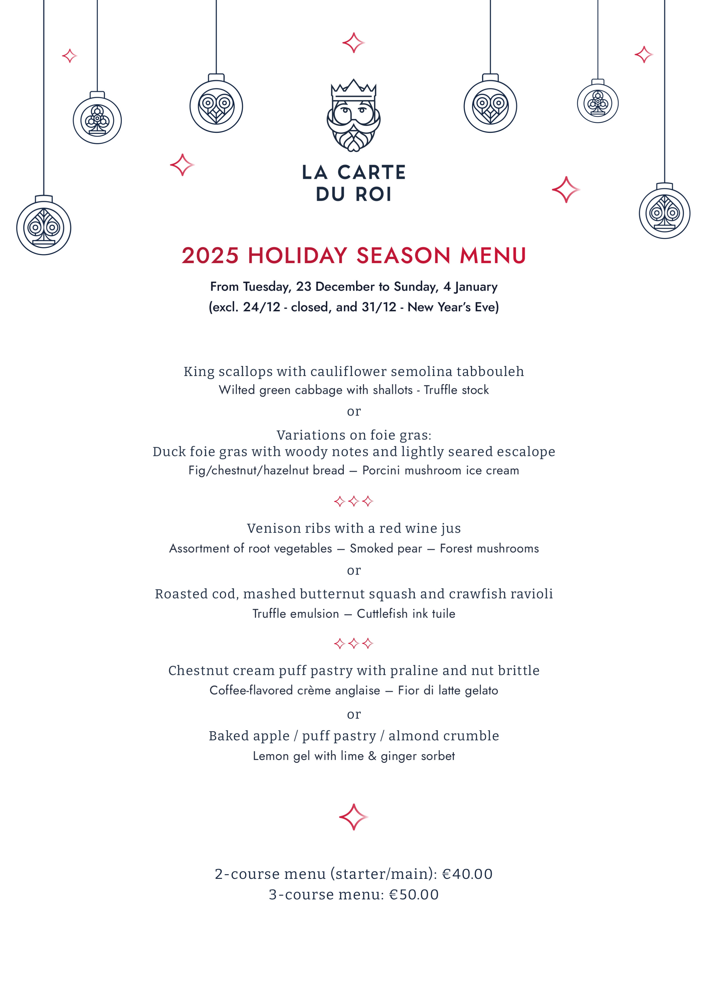 From 22 December to 4 January, the Carte du Roi will offer a Festive Set Menu crafted to celebrate the joy of the season in a refined atmosphere.
